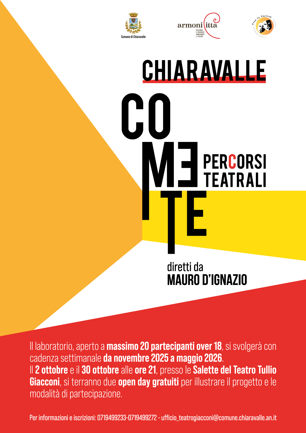 È in arrivo CoMeTe - perCorsi teatrali diretti da Mauro D’Ignazio e promossi dal Comune di Chiaravalle in collaborazione con l’associazione Deus ex machina nell’ambito della programmazione culturale 2025/2026 ArmoniCittà.