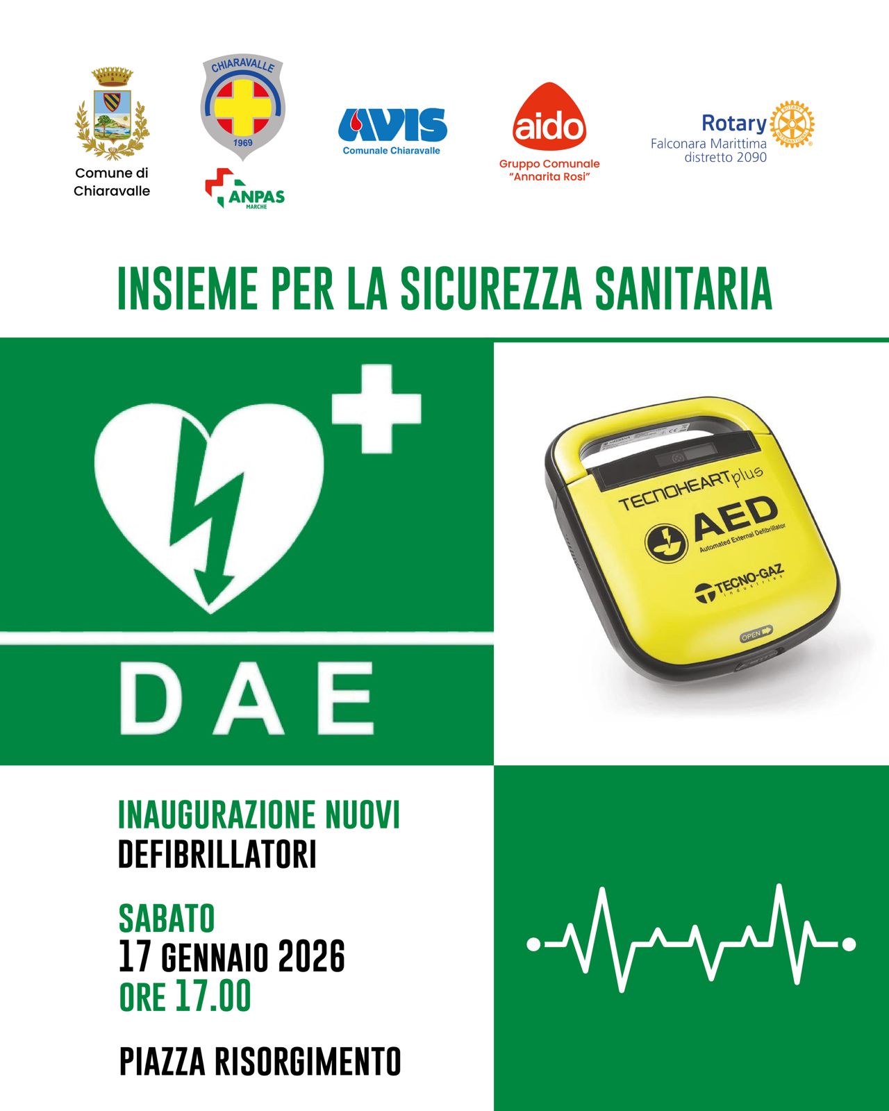 Sabato 17 gennaio 2026 alle ore 17.00, in piazza Risorgimento, si terrà l’inaugurazione dei tre Defibrillatori Automatici Esterni (DAE) installati sul territorio del Comune di Chiaravalle, a beneficio di tutta la cittadinanza.
