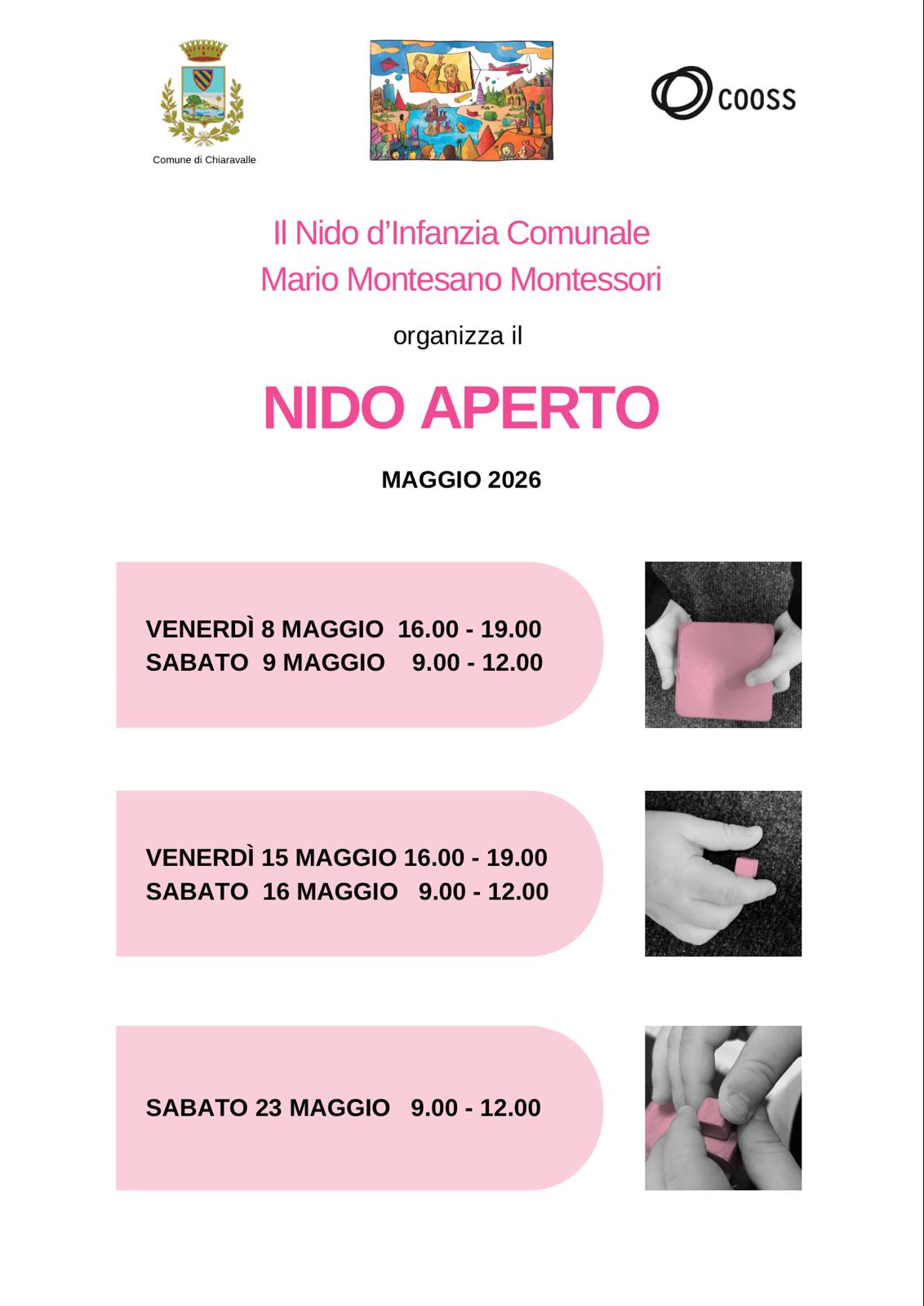 Il Nido d’Infanzia Comunale “Mario Montesano Montessori” organizza nel mese di maggio le seguenti giornate di NIDO APERTO