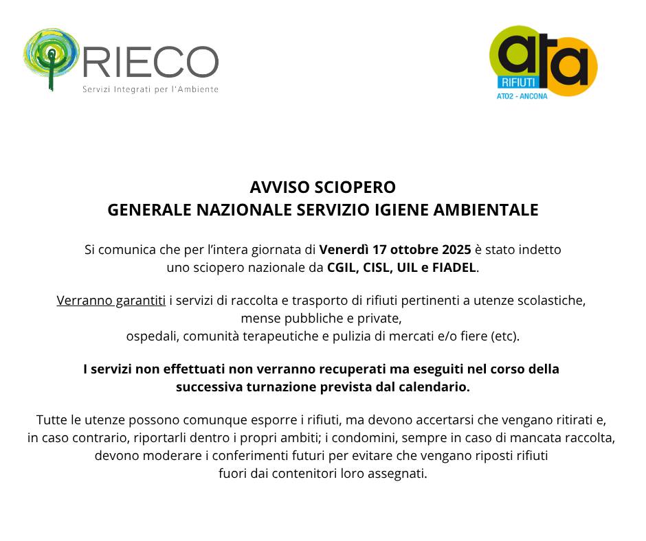 Si comunica che per l'intera giornata di Venerdì 17 ottobre 2025 è stato indetto uno sciopero nazionale da CGIL, CISL, UIL E FIADEL.