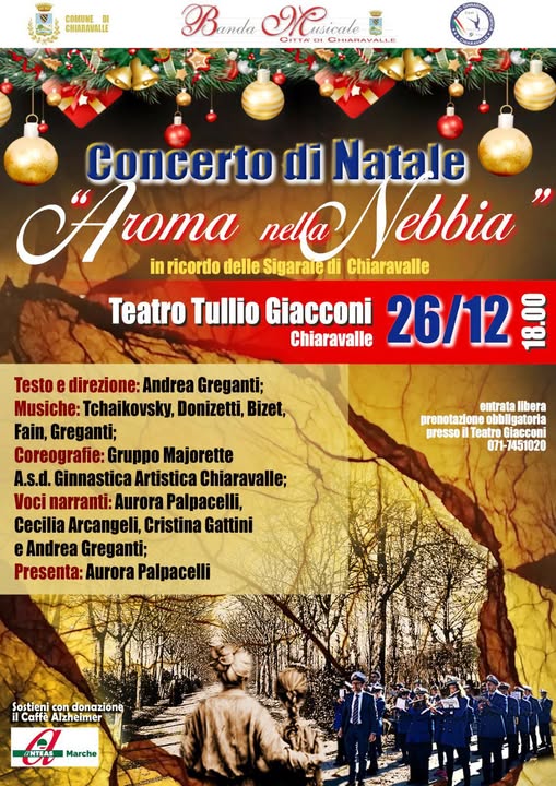 Venerdì 26 dicembre, alle ore 18.00 presso il Teatro Comunale “T. Giacconi”, la Banda Cittadina, con il patrocinio del Comune di Chiaravalle e la partecipazione del Gruppo Majorette ASD Ginnastica Artistica Chiaravalle, presenta il Concerto di Natale “Aroma nella Nebbia” in ricordo delle Sigaraie di Chiaravalle.