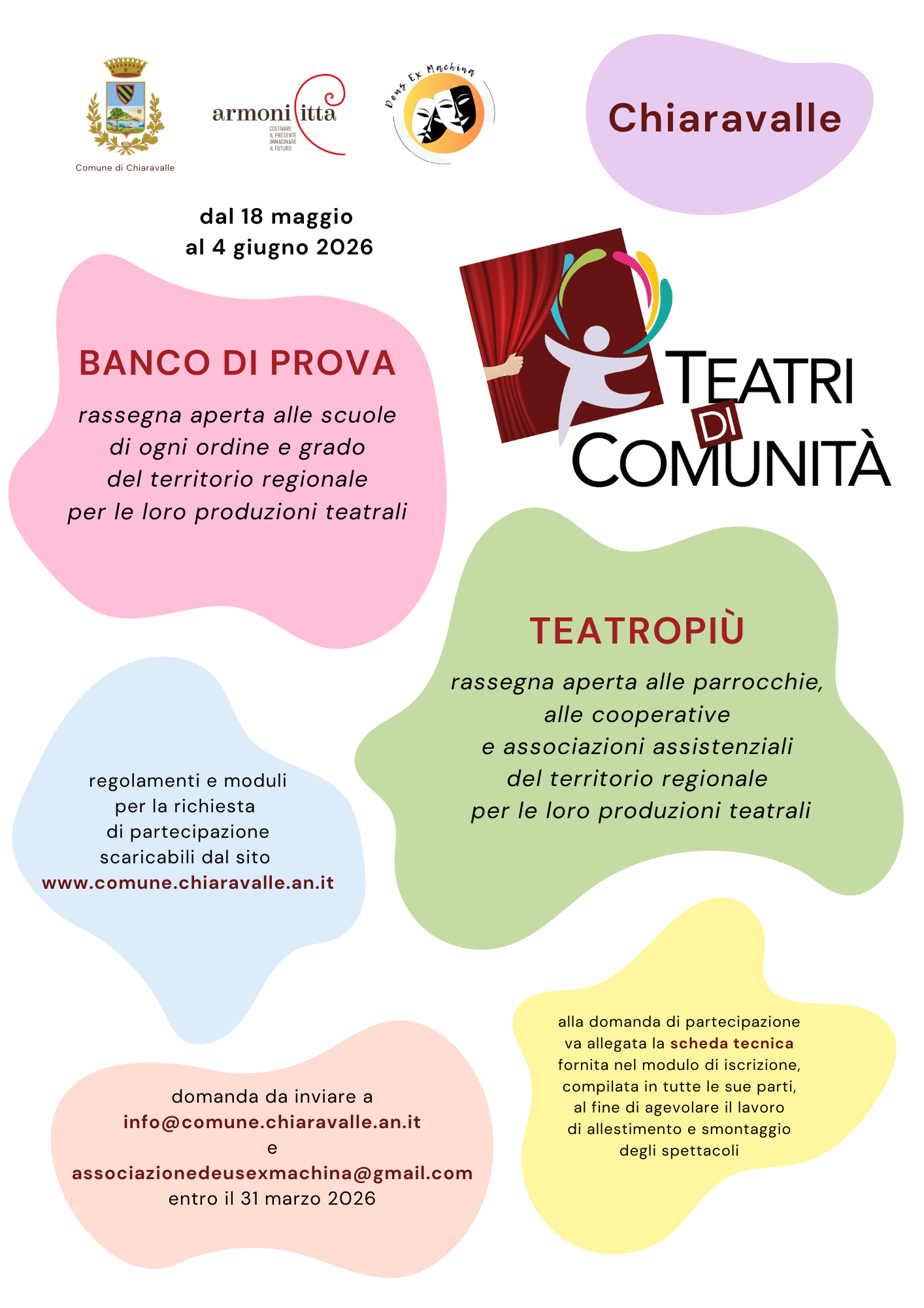 Si comunica che nel periodo dal 18 maggio al 4 giugno 2026 (nei giorni dal lunedì al giovedì di tutte e tre le settimane) avrà luogo presso il Teatro Comunale “Tullio Giacconi” di Chiaravalle la doppia rassegna Teatri di comunità, al cui interno rientrano Banco di prova e TeatroPiù.
